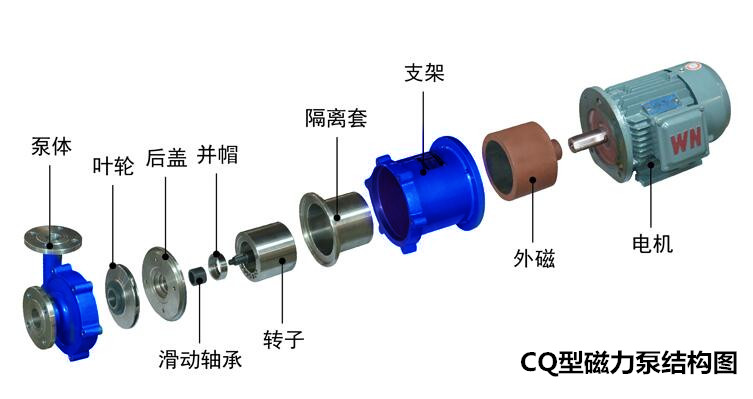 CQ无泄漏磁力离心泵是应用现代磁力学原理,利用永磁体的磁力传动实现扭矩的无接触传递的一种新型泵,就是电机带动外转子(即外磁钢)总成旋转时,通过磁场的作用磁力线穿过隔离套带动内转子(即内磁钢)总成和叶轮同步旋转,由于介质封闭在静止的隔离套内,从而达到无泄漏抽送介质的目的。泵体、泵盖设计了双层冷却(保温)装置,磁力高温泵可使用水、氮气进行可使用水、氮气等对泵体内介质冷却,确保进入泵内的介质保持在较低的温度,磁力保温泵加入蒸气对泵体内介质保温,保证了介质在输送过程中不会冷凝、结晶、气化,彻底解决了机械传动泵的轴封泄漏、冷凝、结晶、气化,彻底解决了机械传动泵的轴封泄漏、冷高温、气化,而设计的全密封、无泄漏、无污染、耐高温、保温、高效节能的新型工业用泵。