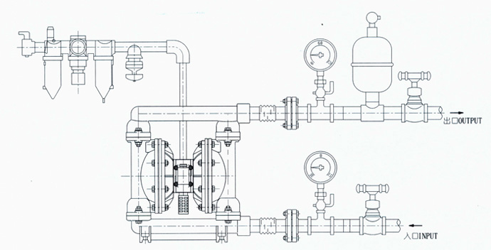 3、气动隔膜泵扬程、流量可通过气阀开度实现无级调节(气压调节在1-7 bar之间);